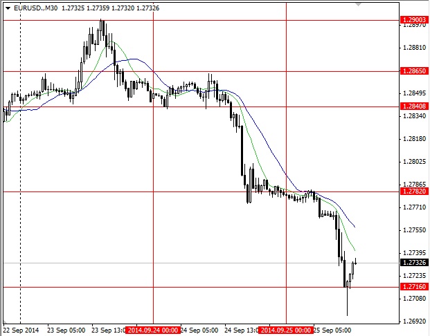 Вчера пара EUR/USD уже попала под давление после публикации данных по индексу делового климата Германии IFO, а выход данных по рынку жилья подтолкнул к пробитию очередного годового минимума. Сегодня, 25 сентября, евро продолжил стремительное свое снижение к новым минимумам. Поддержку пара EUR/USD нашла на психологической отметке 1.27.