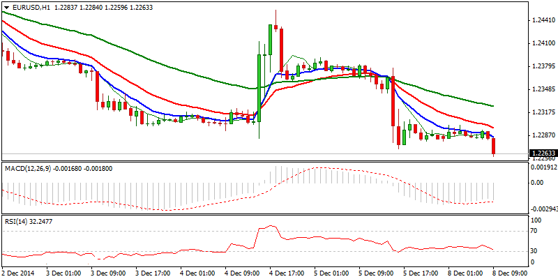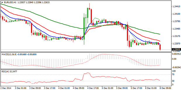 Евро консолидируется под начальным барьером 1.23 после резкого падения на рынке Форекс в прошлую пятницу, 5 декабря 2014 года, на фоне публикации данных платежных ведомостей США, когда цена достигла нового минимума 1.2270, сопровождаемого дневным/недельным закрытием в красной зоне. В целом динамика валютной пары EUR/USD остается "медвежьей" и одобряет дальнейшее снижение к нижней стороне на завершении фазы консолидации.