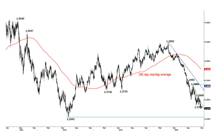 В долгосрочной перспективе валютная пара евро – американский доллар находится в нисходящем тренде с мая 2014 года. "Прорыв сильной области поддержки между 1.2755 (минимум 09 июля 2013 года) и 1.2662 (минимум 13 ноября 2012 года) открыл путь для снижения по направлению к сильной поддержке на уровне 1.2043 (минимум 24 июля.2012 года). Ключевое сопротивление находится на уровне 1.2600 (максимум 19 ноября 2014 года)", - отмечают эксперты компании Swissquote.