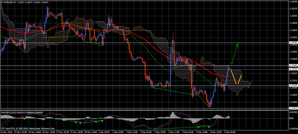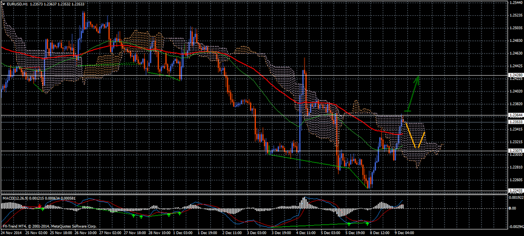 EUR/USD цена готовится к краткосрочной коррекции. Цена торгуется на уровне скользящих средних EMA (50 и 100) и облака Ишимоку, свидетельствуя о коррекционном состоянии на рынке. MACD средние так же как и импульсы OsMA находятся выше нуля, продолжая рост указывают на возможную, дальнейшую покупку в перспективе. Весомые уровни: Buy – 1.2364; 1.2428; Sell – 1.2307; 1.2243. Цели: коррекция. Как альтернатива, возможна покупка с пробитием ценой отметки 1.2370. Цель – 1.2428, сообщили эксперты Forex Trend.