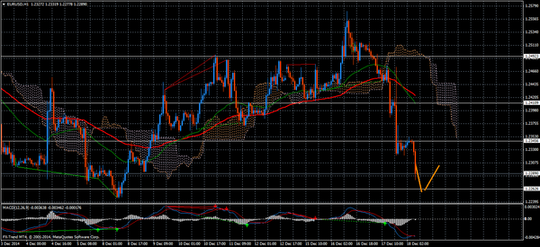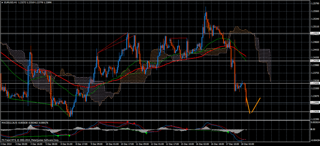 Валютная пара EUR/USD вместо ожидаемой коррекции весь день спускалась вниз, пробив все возможные уровни поддержки. Торговый диапазон составил порядка 236-ти пунктов. При этом отметка High была сформирована в начале дня, поднявшись к максимуму – 1.2515, в то время как Low уровень можно было наблюдать в зоне медведей, у минимума – 1.2277. В течение дня сегодня, 18 декабря 2014, ожидаем коррекцию между уровнями 1.2262 и 1.2345, отметили аналитики Forex Trend.
