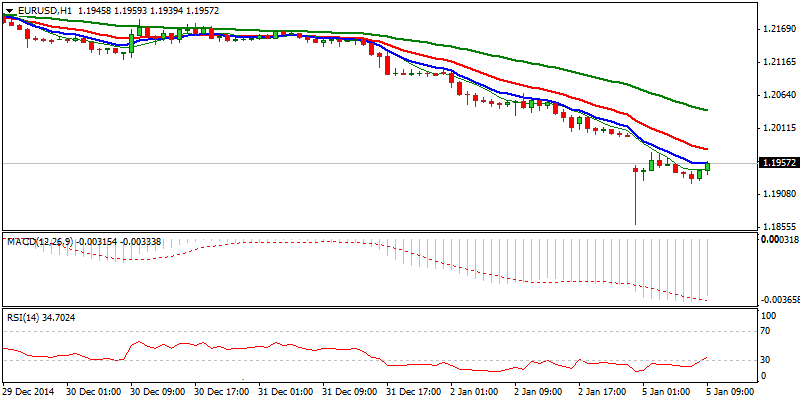 Евро закрылся на рынке Форекс в первый торговый день 2015 года ниже психологического уровня 1.2000, при этом на дальнейшее ослабление указывал гэп вниз при открытии недели. Цена опустилась ниже уровня 1.1900, отметив очередной минимум 1.1860. Фаза консолидации по валютной паре евро - американский доллар идет полным ходом и удерживается ниже уровня 1.2000, который теперь выступает в качестве сильного сопротивления и должен, в идеале, ограничить коррекционные попытки, в условиях перепроданности на краткосрочных индикаторах. "В целом негативное настроение подкрепляется негативными фундаментальными данными по Еврозоне, которые удерживают единую валюту под давлением", - полагают эксперты компании FinFX. Закрытие курса валютной пары евро - американский доллар ниже сопротивления 1.20 подтвердит завершение месячного «медвежьего» флага, поскольку были пройдены все критические поддержки, и следующая значительная поддержка находится на уровне 1.1640, минимума 2005 года, ниже которого для валютной пары EUR/USD откроется путь к 1.1210, 61.8% Фибоначчи к многолетнему росту 0.8225/1.6039. Краткосрочные медведи были бы отодвинуты, в случае возврата и закрытия выше уровня 1.20, также 38.2% Фибоначчи к снижению 1.2220/1.1860.
