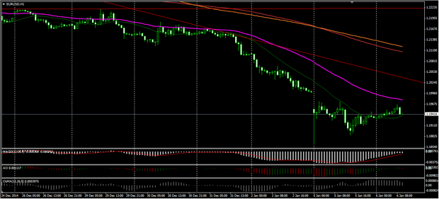 Осциллятор MACD валютной пары EUR/USD на часовом графике находится на отрицательной территории, столбики гистограммы выравниваются, что указывает на неопределенность курса валютной пары евро - американский доллар на рынке Forex. "На 4-х часовом графике мы видим, что MACD находится на отрицательной территории, столбики гистограммы также выравниваются, что указывает на неопределенность курса валютной пары на рынке Форекс", - отмечают эксперты брокерской компании TurboForex. Пара евро - американский доллар торгуется сегодня, 6 января 2015 года, ниже часовой скользящей средней 55 ЕМА и 200 ЕМА. Уровнями сопротивления становятся часовые скользящие средние сначала 55 ЕМА, затем 20 ЕМА. На данный момент пара отметила новый максимум 1.1967, хотя и не достигла вчерашнего максимума. Уровнем поддержки будет выступать вчерашний минимум 1.1859.