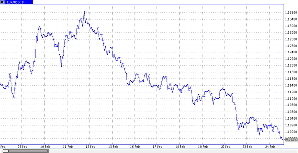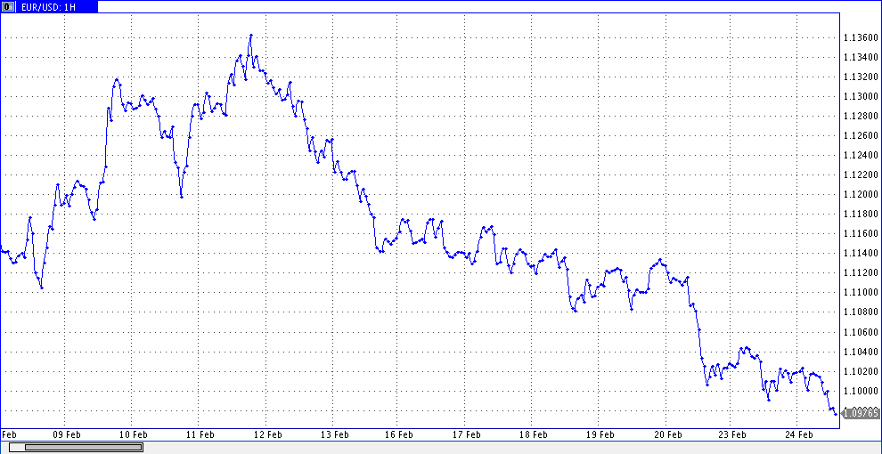 Индекс деловых настроений в Германии составил в феврале 105,7 против ожидаемого уровня 106,7. На этих известиях пара EUR/USD кратковременно опустилась ниже уровня 1,1000. Открытие торгов во вторник парой EUR/USD состоялось на уровне 1.1026, закрылись торги на уровне 1.1018. Скорость изменения тренда очень высока. Наиболее вероятен сценарий: падения EUR/USD к 1.0970. Наименее вероятен рост EUR/USD к уровню 1.1065, отметили аналитики SFX Markets.