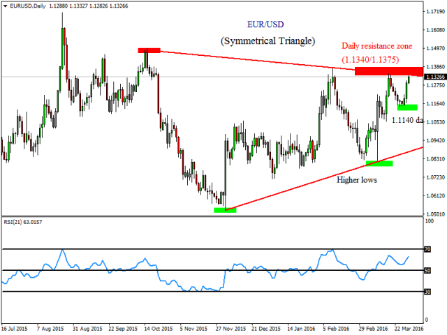 EUR/USD набрала обороты в начале американской сессии, взобравшись к 1.1364 и коснувшись максимального с 11 февраля уровня. Ралли остановилось недалеко от максимумов 2016 у 1.1375. Пока доллар активно снижается второй день подряд, евро выбился в лидеры. Аналитики Форекс-компании FXTM, напоминают, что причиной распродаж бакса стали голубиные заявления главы ФРС Йеллен.