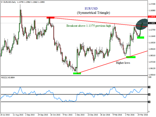 Евро сумел совершить прорыв верхней границы симметричного треугольника с пика 1.1497, что стало сильным бычьим сигналом, действующим в среднесрочной перспективе. Аналитики Форекс-компании FXTM советуют подождать недельного закрытия пары выше 1.1400, чтобы подтвердился бычий разворот.