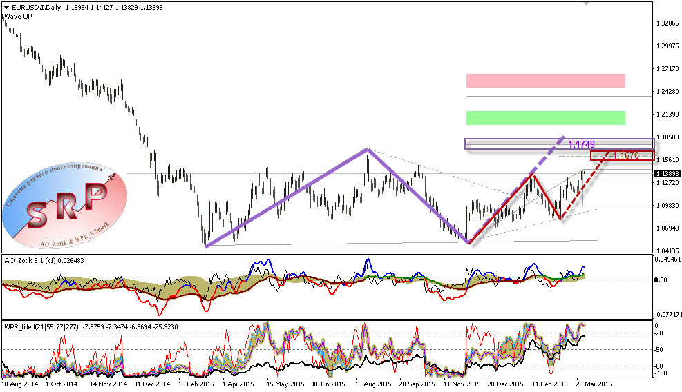 Поведение пары EUR/USD на Forex тем временем говорит о продолжении коррекции уровня Weekly к нисходящему долгосрочному тренду. С помощью инструментария СРП, Вы можете увидеть на графике Daily структуру АВС вверх, в С волне которой прослеживается меньший по уровню алгоритм АВС. Целями восходящего движения могут стать отметки 1.1670 и 1.1749, отмечают трейдеры кафедры системы раннего прогнозирования Академии Masterforex-V (AO_Zotik и WPR_VSmark).