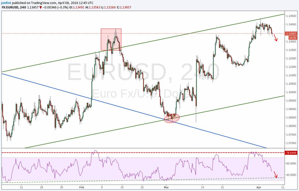 Участники рынка ожидают публикацию протокола последнего заседания FOMC, которое намечено на 21:00 по МСК сегодня, 6 апреля. Стоит учитывать, что волатильность пары EUR/USD сегодня возрастет. Курс евро продолжает снижение после теста верхней границы восходящего канала. Индикатор RSI на четырехчасовом графике направлен вниз, что сигнализирует в пользу дальнейшего нисходящего движения. В рамках прогноза EUR/USD ожидается снижение котировок к отметке 1,1300, пробой которой откроет путь к поддержке на уровне 1,1150.