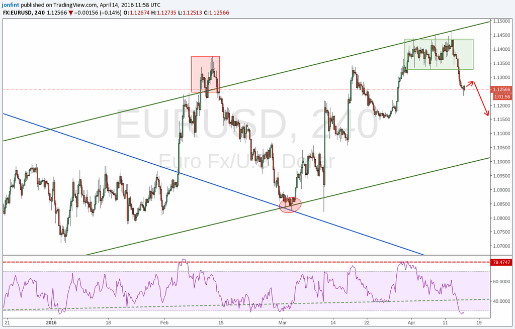 Сегодня, 14 апреля, валютная пара EUR/USD стремительно снизилась после завершения консолидации. На четырехчасовом графике индикатор RSI замедлил снижение, что говорит о консолидации котировок вблизи уровня 1,1300. Ближайшая цель для снижения евро/доллара находится на уровне 1,1150. Эксперты Форекс предполагают, что после консолидации возможно снижение курса единой валюты.