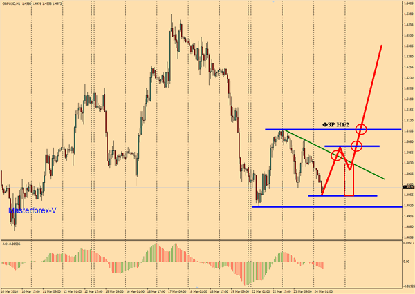 Валютная пара продолжает двигаться в узком коридоре флета Н1/2 1,4929-1,5092, формируя, тем самым, потенциал дальнейшего движения, потому как чем дольше флет, тем мощней выход из него. Учитывая, что валютная пара-союзник EURUSD в настоящее время двигается у минимума, а также то, что сформирована волна в(С) Н4 для дальнейшего укрепления доллара США, основными подсказками для выбора того или иного варианта развития движения валютной пары будут движения именно этих инструментов: золота и валютной пары EURUSD.