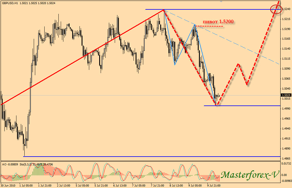 На пятничных торгах, 9.07.2010 г., как и предполагал Факультет изучения торговой системы Masterforex-V, валютная пара GBPUSD пробила нижнюю границу флета, тем самым сформировав волну "а(С)" / "С" н4 и ФЗР.