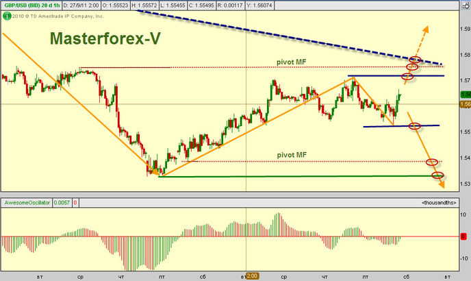 Курс британского фунта стерлингов тем временем закончил медвежью волну А/В уровня Н3 и находится в зоне флета. Как утверждают эксперты факультета детального изучения торговой системы Мasterforex-V, пробитие максимума 1,5715 породит бычий ФЗР с созданием волны а(С)/С, на пути которой выступят уровни сопротивления: наклонный канал МФ и пивот МФ в области 1,5746. Пробитие нижней границы флета -1,5532 сформирует медвежий ФЗР – в сторону долгосрочного тренда. Поддержками для этого движения станут пивот MФ 1.5385 и локальный минимум 1.5327, преодолев который пара GBPUSD начнет долгосрочную медвежью волну с(С).