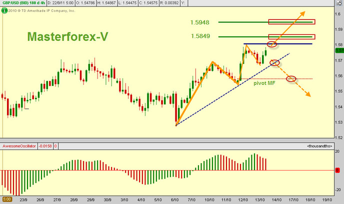 Тем временем курс британского фунта находится в краткосрочном флете, формируя, предположительно волну В(С) уровня Н1. Эксперты факультета детального изучения торговой системы Masterforex-V считают, что пробив локальный максимум 1,5796, пара GBPUSD продолжит формирование среднесрочной бычьей волны С. Ближайшими сопротивлениями остаются уровни Фибоначчи 1.5849, 1.5948. Пробитие бычьего наклонного канала МФ, а также пивота МФ 1.5582 закончит текущее бычье движение и начнет формировать медвежью волну А/В.