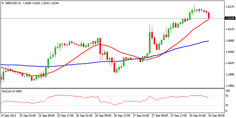 Кабель остается устойчивым, так как очередное расширение выше завершило краткосрочную коррекционную фазу 1.6161/1.5953. Цена отметила незначительный очередной максимум на отметке 1.6179, с положительно выровненными краткосрочными индикаторами, поддерживающими возможную атаку на психологический барьер 1.6200, - сообщили аналитикам раздела "Новости Форекс" портала "Биржевой лидер" эксперты компании FinFX (входит в ТОП рейтинга брокеров форекс Академии Masterforex-V). Однако сегодняшнее, 30 сентября 2013 года, состояние перекупленности на индикаторах более низких таймфреймов показывает коррекционный откат, предшествующий очередному ралли, с начальной поддержкой на уровне 1.6130, внутридневной максимум пятницы/23.6% от 1.5953/1.6179 перед 1.6100, 38.2% /максимум 26 /09 /55DMA, которые рассматриваются как идеальная точка разворота. Дневные индикаторы перекупленности на рынке Форекс по валютной паре GBP/USD, однако, требует осторожности.