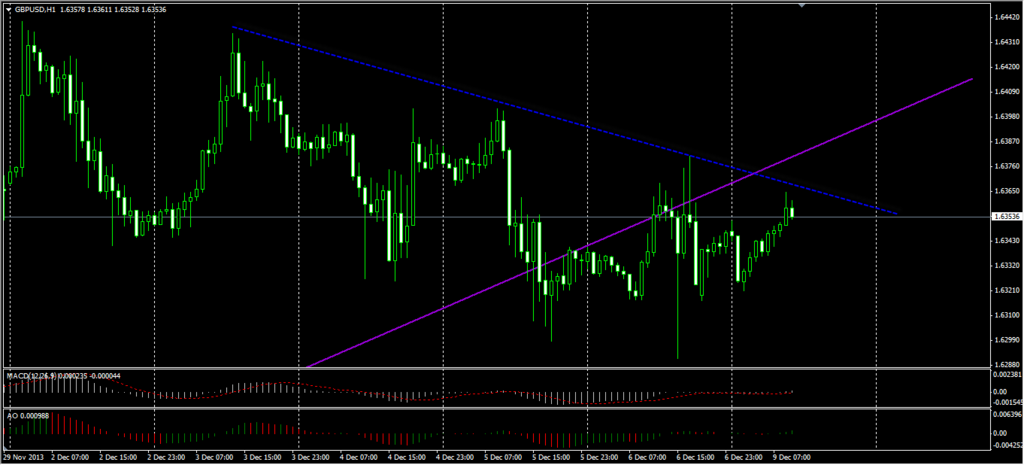 Пара GBP/USD продолжает свое падение, открывая текущую неделю снижением до уровня 1.6322. Правда после этого заметен рост к пробитому в пятницу наклонному каналу. Но пока пара перемещается в узком диапазоне 1.6392-1.6291. День сегодня, 9 декабря 2013 года, не богат на публикации экономических новостей. Поздно вечером, в 21.15 мск, выступит глава Банка Англии Марк Карни на экономическом клубе в Нью-Йорке. В 22.05 мск президент ФРС Сент-Луиса Джеймс Буллард будет говорить об экономических перспективах и валютной политике в дипломированном обществе финансовых аналитиков Сент-Луиса. И в том, и в другом случае аналитики и трейдеры внимательно будут прислушиваться к их речам, и волатильность на рынке будет высокой, сообщили аналитикам раздела "Новости Форекс" портала «Биржевой Лидер» эксперты компании TurboForex.