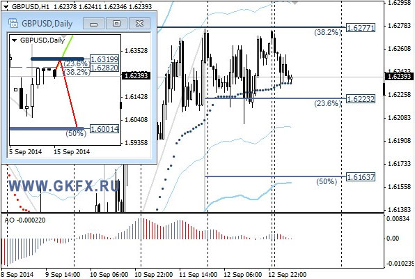 Пара GBPUSD торговалась на рынке Forex разнонаправлено в ожидании выбора жителей Шотландии. Во главе стоит вопрос, отсоединится ли Шотландия от Великобритании? Референдум по этому вопросу состоится 18 сентября, а до этого времени динамика валютной пары фунт стерлингов - американский доллар будет неровной. В таких условиях рекомендации не даются. "На эту неделю традиционно рассматриваю два варианта возможного движения цены, основной красный и альтернативный зеленый", - сообщил эксперт брокерской компании GKFX. Значимые уровни на сегодня, 15 сентября 2014 года, отмечены на часовом графике. Индикатор АО находится у нуля, указывая на неопределенность. Индикатор тренда указывает на снижение курса валютной пары фунт стерлингов - американский доллар на рынке Форекс. Следует оставаться вне рынка.