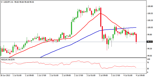 Пара USD/JPY на валютном рынке Форекс торгуется в краткосрочной фазе коррекции, так как отклонение от верхней стороны 100.84 вызвало резкий откат, который снизился к 99.25, пробивая важную поддержку и предыдущую платформу на уровне 99.50. Дневное закрытие ниже психологического барьера 100.00 увеличивает риск глубокого разворота, так как часовые индикаторы удерживаются на отрицательной территории, и ценовое действие ограничивается падающей 20DMA, - сообщили аналитикам раздела "Новости Форекс" портала "Биржевой лидер" эксперты компании FinFX. Расширение ниже 99.00 подтвердило бы дальнейшую коррекцию и открыло бы предыдущий пик 98.70. Альтернативный сценарий требует устойчивого прорыва выше 100, также средней точки падения в среду, 3 июля 2013 года, чтобы уберечь пару от дальнейшего скольжения и переместить фокус внимания по направлению к следующим целям 100.84/101.00.