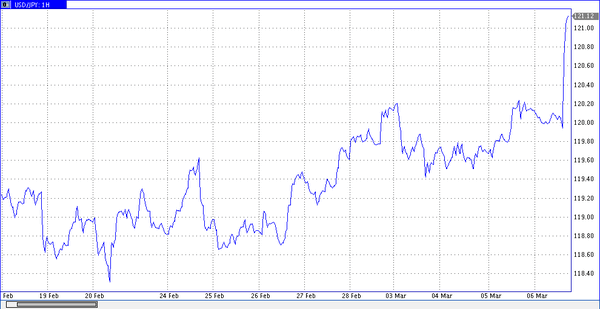 Наступающая неделя не изобилует важными публикациями в Соединенных Штатах. В четверг, 12 марта 2015, в США опубликуют статистику по розничным продажам. В пятницу, 13 марта 2015, публикуется индекс цен производителей. В январе падение PPI отметило пятилетний рекорд (-0,8%). Новое сильное падение индекса стало единственной потенциальной угрозой для укрепившегося доллара США на следующей неделе. Пара USD/JPY третий месяц подряд торгуется в диапазоне. Пара сформировала новые высокие минимумы с середины января 2015. Технический анализ показывает, что пара готова к пробою вверх. Текущая консолидация пары была краткосрочной. Ранее период консолидации пары имел большую длительность, что указывает на возможность дальнейшей стагнации пары USD/JPY.