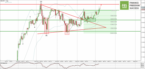 На прошедшей неделе пара USD/JPY пробила сопротивление в отметке 120.50, где был остановлен предыдущий короткий импульс 1. Также в данной отметке была установлена цель для покупки в предыдущих прогнозах. Пробой этого сопротивления ускорил активную волну 3 от пятого импульса 5 (среднесрочный) начала середины декабря 2014. Краткосрочный импульс начался с разворотом пары вверх из области поддержки, окружающей поддержку в отметке 118.50. USD/JPY вновь пытается пробить уровень 121.00. Следующая цель для покупок - 121.70, отметили аналитики FBS.