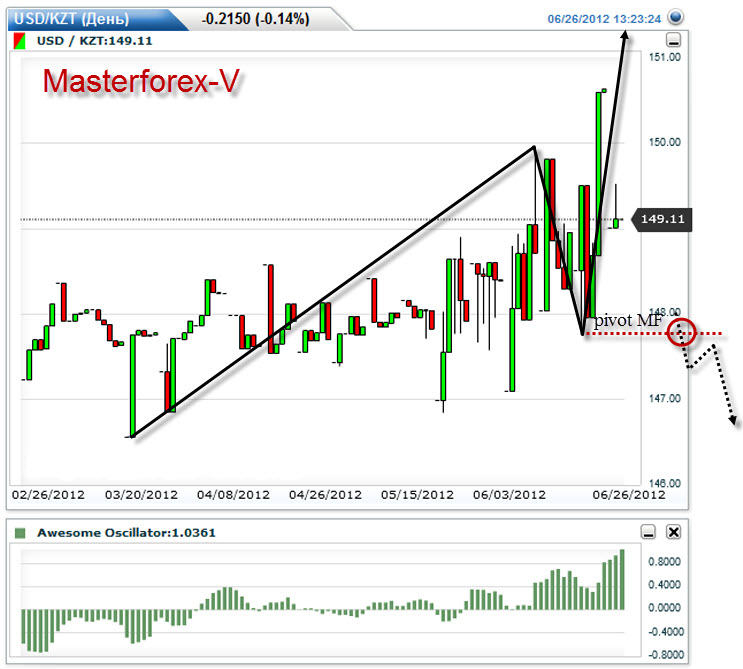 3. Курс тенге торгуется в очередной бычьей волне С или а(С) - поясняют эксперты факультета онлайн-обучения торговой системе Masterforex-V. Говорить же о развороте тренда без пробития пивота МФ с последующим ФЗР (см.график) - преждевременно.