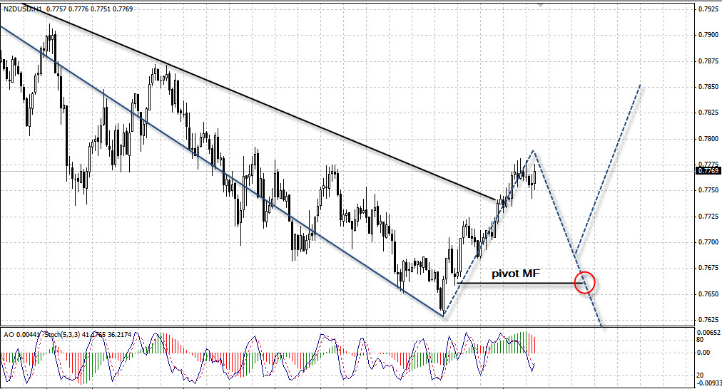 Эксперты Факультета детального изучения торговой системы Masterforex-V полагают, что пробив наклонный канал МФ и защитный пивот МФ, валютная пара NZDUSD формирует волну "старшего таймфрейма" ко всей медвежьей 0.7972-0.7630 уровня Н8-12. После ее завершения наступит "момент истины", который и покажет направление для дальнейшего движения пары.
