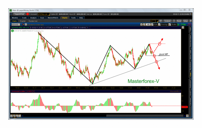 И ничего удивительного, что на рынке Forex этот отчёт ознаменовался падением курса новозеландского доллара. Эксперты факультета детального изучения торговой системы Masterforex-V поясняют, что на данный момент формируется медвежья волна в(С)в предполагаемой волне С уровня Daily. Пробитие пивота МФ и наклонного канала МФ укажет нам на отмену этого предположения, формируя медвежью волну старшего волнового уровня. В случае не пробития пивота МФ и наклонного канала МФ- восходящее движение продолжится в виде бычьей волны с(С) в рамках волны С уровня Daily.