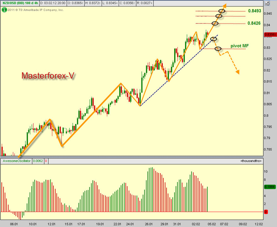 Курс новозеландского доллара продолжает укрепление, отрабатывая бычий сценарий, рассмотренный от 02/02/2012. На данный момент происходит удлинение долгосрочной бычьей волне С(С) или 3-й волне в С, формируя подволну А(С)/С уровня Н1, считают эксперты факультета изучения торговой системы Мasterforex-V. Ближайшими сопротивлениями выступят уровни Фибоначчи 0.8426, 0.8453, 0.8493. Окончанием бычьей подволны станет пробитие наклонного канала МФ и пивота МФ 0.8295.