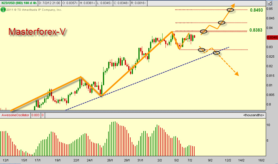 Курс новозеландского доллара по-прежнему находится в процессе формирования долгосрочной волны 3-й в С или С(С). Эксперты факультета изучения торговой системы Мasterforex-V отмечают окончание формирования 3-й подволны в С или подволны С(С) уровня Н16. На данный момент происходит формирование 5-й подволны или подволны А в Собаке Элдера/МФ. После пробития локального максимума, основными сопротивлениями станут уровни Фибоначчи 0.8383, 0.8418/26, 0.8493. Пробитие минимума 0.8285 покажет начало формирования волны А/В или 4-й старшего волнового уровня. Ближайшей важной поддержкой вступает бычий наклонный канал МФ.