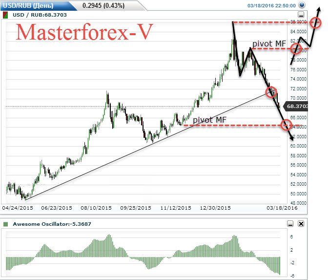 "Сегодня, 23 марта, курс рубля после того, как был важный уровень поддержки - линия наклонного канала МФ, продолжает укрепляться к доллару США, формируя коррекцию по отношению к долгосрочному восходящему тренду, и торгуется на отметке 68,37 рубля за доллар", - рассказали аналитики факультета онлайн-обучения торговой системы Masterforex-V. Следующий важный уровень поддержки находится на отметке 64,35 рубля за доллар США, а говорить о продолжении восходящего движения без пробития такого важного уровня сопротивления, как уровень пивота МФ 80,57, и закрепления над ним пока рано.