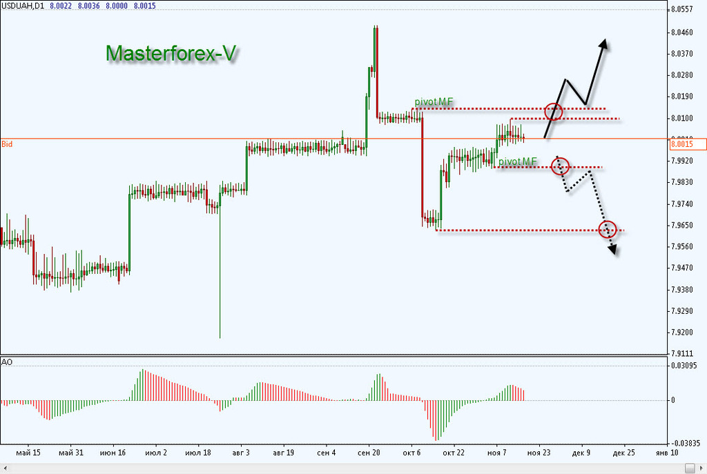 3. Согласно новейшему техническому анализу Masterforex-V, курс гривны торгуется под важным сопротивлением - пивотом-MF 8,138 - говорят специалисты факультета изучения торговой системы Masterforex-V. В случае пробития и закрепления за данным уровнем откроется возможность движения к следующему важному уровню - локальному максимуму 8,0489. Пробитие пивота-MF в районе 7,9875 с последующим закреплении под ним положит начало волны старшего волнового уровня.