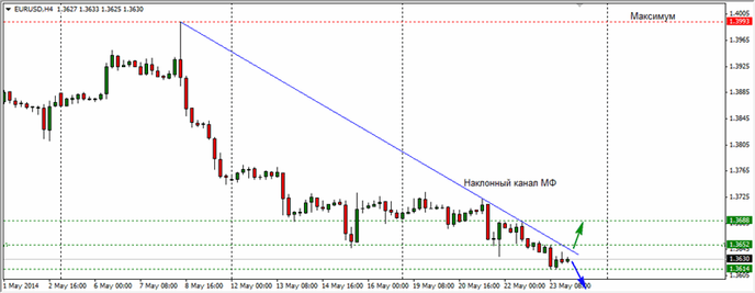 Если цена на графике пробьет наклонный канал МФ, который изображен на графике синим цветом, вверх, среднесрочный тренд снижения евро будет приостановлен. Рост цены выше уровня сопротивления 1,3652 нацелит пару на рост в район 1,3688. В данном случае будет происходить ослабление курса доллара к евро, а также сохранение долгосрочной тенденции роста евро, которое показано зеленой стрелкой.