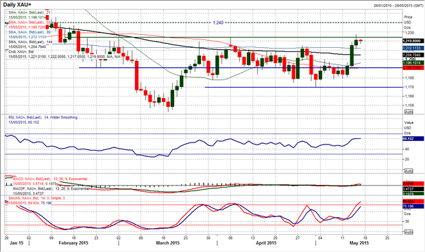 С сохраняющейся слабостью доллара США, наконец, появился импульс вверх в цене на золото. Может, наконец, случиться так, что золото, вырвется из своего торгового диапазона? Вторая последовательная положительная свеча вчера отметила цену на прорыве выше сопротивления 1224,10, достигнув 3-месячного максимума. Тем не менее, до сих пор не было ни одного заключительного прорыва, и цена на золото вновь вернулась, чтобы закрыться еще раз в пределах своего диапазона. Сегодняшняя сессия снова, поэтому, важна, поскольку после трех положительных свечей подряд (не наблюдаемых с середины марта) этот импульс должен продолжиться. RSI прилагает усилия, чтобы подняться выше 60, и если это возможно увидеть, то я вижу, что пробой диапазона может быть подтвержден. Снова ждем подтверждения. Подтвержденный пробой открывает путь к 1236,50. Ключевая краткосрочная поддержка находится на уровне 1211,60.