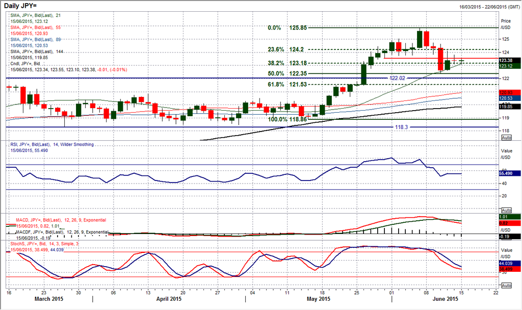 Техническое ралли, которое показало достижение валютной парой доллар/иена дна, на уровне 122.43 теперь, кажется, останавливается, так как цена продолжает последовательность более низких дневных максимумов (по 5 в ряд). Группа сопротивлений старых поддержек между 123.50/124.00, кажется, действует как барьер сейчас и это означает, что индикаторы импульса остаются в режиме коррекции. Следует отметить, что RSI сейчас пытается подняться выше 60, и можно предположить, что прогноз, в лучшем случае, остается нейтральным в краткосрочной перспективе. Однако при том, что MACD и стохастик по-прежнему падают, баланс остается отрицательным для дальнейшего отката назад по направлению к ключевому пробою 122,02. Часовой график показывает, что период боковой консолидации идет полным ходом и минимум пятницы 123.10 - важный уровень, на котором необходимо удержаться, чтобы предотвратить скольжение назад к 122.43. Последовательность более низких максимумов будет нарушен на движении выше 123.80.