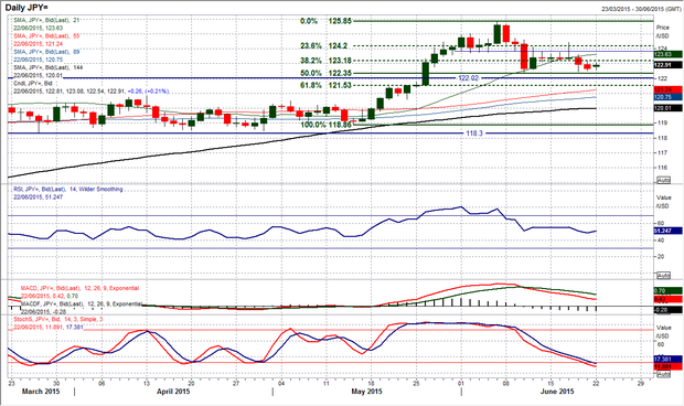 Важность 50% коррекции Фибоначчи к ралли 118,86/125,85 на уровне 122,35 растет. Поддержка удерживается, но давление нарастает. В какой-то момент я ожидал отступления назад к поддержке 122,02, и я до сих пор думаю, что это возможно, но в ближайшей перспективе "медведи" набирают обороты. Пробой уровня 50% Фибо приведет в дальнейшем к 61,8% на отметке 121.53. Там в настоящее время уже наблюдаются две последовательных негативных свечи, которые следуют за серией нейтральных свечей. Пока сегодняшние торги были довольно осторожны с небольшим реальным движением, но все индикаторы импульса выглядят коррекционными и RSI находится сейчас на одномесячном минимуме. Я до сих пор ожидаю там еще один ключевой минимум, который будет находиться в районе старого прорыва. Я ранее думал, что он, возможно, уже достигнут, но отскок от 50% уровня Фибоначчи не продлился слишком долго, прежде скольжения обратно. Сейчас наблюдается консолидация между уровнями 38.2% Фибо, на отметке 123,20 и 50%.