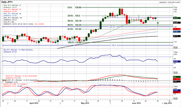Дневные индикаторы импульса снова развернулись ниже(не было неожиданным), при этом RSI на самом низком уровне с середины мая (в соответствии с падением назад в цене). Следующее негативное движение придет с окончательным прорывом ниже 122.00. Это будет проблемой для быков и вновь откроет путь к поддержке 120.60. На данный момент я все еще рассматриваю это, как "бычью" коррекцию по американскому доллару, но здесь может быть некоторая значительная волатильность, теряющая силу, о которой пока можно сказать с убеждением.