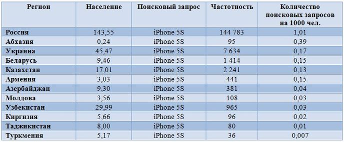 Украинцы намного реже, чем россияне, интересуются iPhone 5S в Интернете, что отчетливо видно из следующей таблицы, демонстрирующей статистику поисковых запросов в wordstat.yandex.ru при пересчете на 1 тысячу населения: