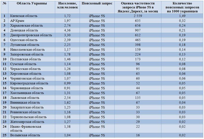 - жители наиболее плотно заселенной области – Донецкой (4,36 млн. человек) – значительно реже, чем жители той же Киевской области запрашивали в Яндексе iPhone 5S – 2 559 раз.