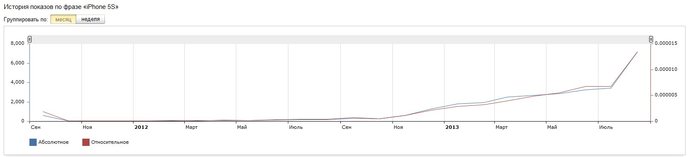 Согласно данным сервиса wordstat.yandex.ru, меньше всего интересуются iPhone 5S жители Волынской области (всего 16 запросов за месяц). Для сравнения: