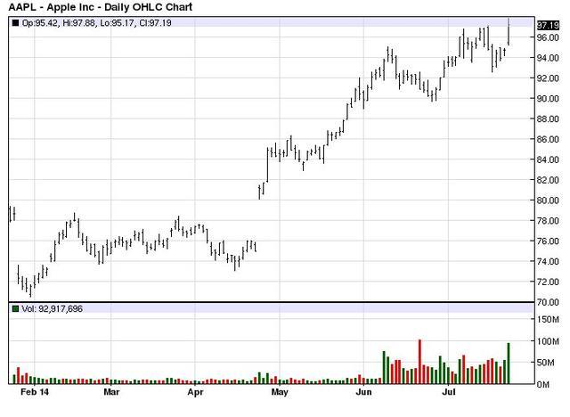 Сегодня акции компании Apple, отмечают аналитики брокера RVD Markets, к середине дня прибавили 2,61% до 97,19 долларов.