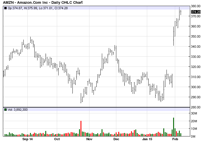 Amazon после подведения итогов четвертого квартала 2014 года порадовала инвесторов — после провала в третьем квартале результаты оказались выше ожиданий. Предпраздничная торговля в этом году отличалась высокой активностью и компания увеличила выручку на 15% с предыдущего результата до 29,3 млрд. долларов.