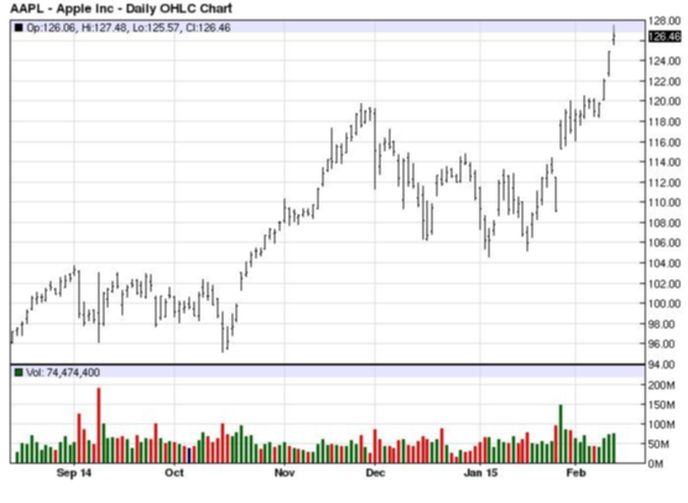 Акции Apple сегодня, как отмечают аналитики брокера TurboForex, к середине дня подорожали на 1,27 доллара, закрепившись около отметки в 126,46 доллара.