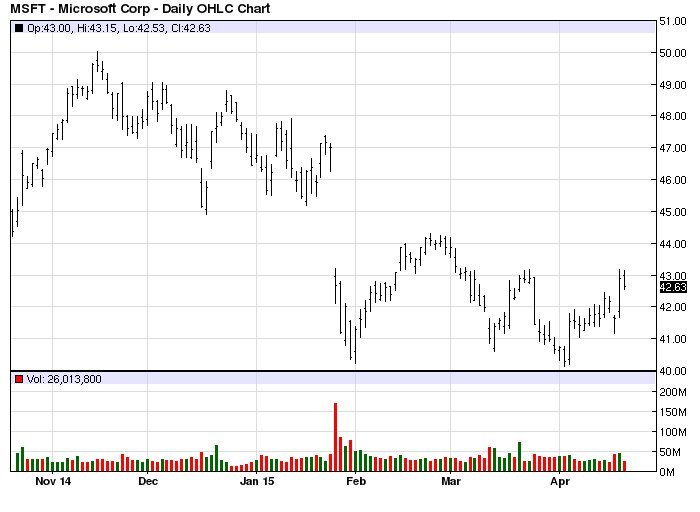 Акции Microsoft сегодня, отмечают аналитики брокера RVD Markets, к середине потеряли 0,63%, закрепившись около отметки в 42,63 доллара.