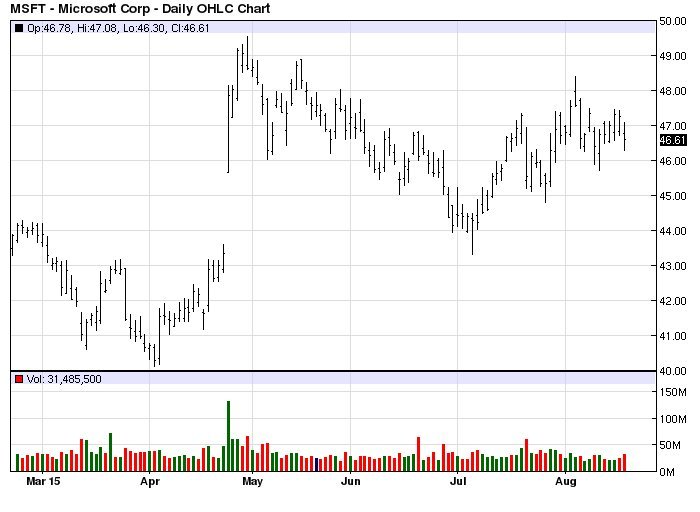 Акции Microsoft сегодня, как отмечают аналитики брокера TurboForex, потеряли к середине дня 1,40% и закрепились около отметки в 46,61 доллара.