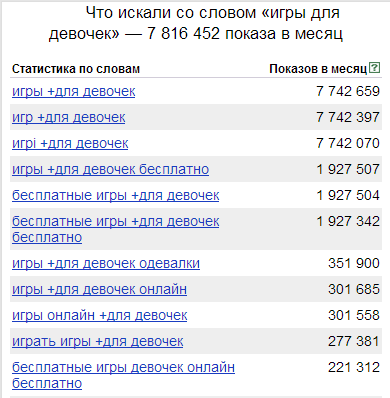 Как видно из фото, полученного благодаря сервису Яндекс.Директ, жители Российской Федерации интересовались запросом "игры для девочек" в поисковой системе Яндекс 7 816 452 раза в августе текущего года.