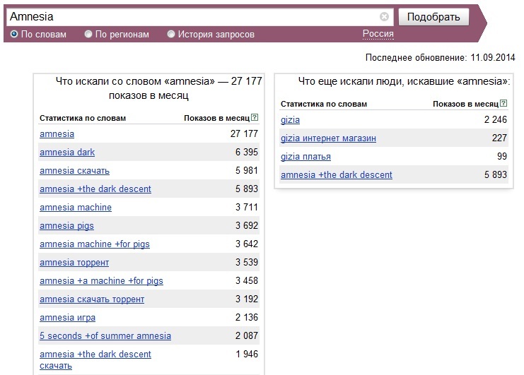 С популяризацией интернет-бизнеса многие предприниматели столкнулись с отсутствием навыков привлечения клиентов. Для того чтобы получить лояльных клиентов из Всемирной паутины, необходимо провести детальный анализ всех поисковых запросов по нужной теме, а после этого, опираясь на полученные данные, оптимизировать работу сайта под выдачу различных поисковых систем. Благодаря сервису wordstat.yandex.ru удалось узнать, что при вводе запроса «Amnesia» большинство россиян хотят найти информацию о какой-то из частей игры, а также ссылки на скачивание указанных продуктов. Об этом говорят такие запросы пользователей: