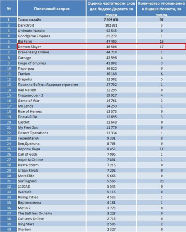 - Еще одним важным компонентом для определения популярности компьютерной игры является количество упоминаний в различных СМИ. Так, в новостной ленте сервиса Яндекс.Новости игра «Demon Slayer» фигурировала 17 раз. Эксперты уверены, что это отличный показатель для браузерной игры, при том что многие проекты данного направления практически не имеют поддержки СМИ.