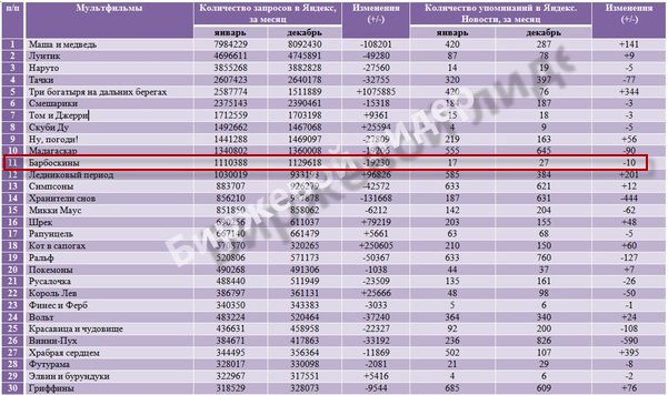 Исходя из данных таблицы, можно сказать, что мультфильм "Барбоскины" является одним из самых популярных в России по данным поисковой системы Яндекс, так