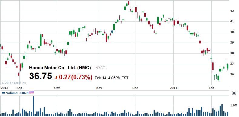 "Сегодня, 17 февраля 2014 г., акции автопроизводителя Honda торгуются на уровне 36,75 доллара США", - объяснили аналитики брокерской компании FBS: