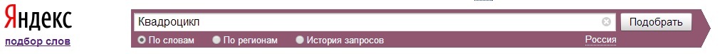 Как видно из полученный данных, запрос «квадроцикл» был введен в поисковой системе Яндекс 571 752 раза за последний месяц.