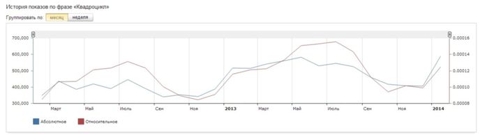 - Наивысший интерес россиян к запросу «квадроцикл» был зафиксирован в августе 2013 года (около 685 тысяч запросов);
